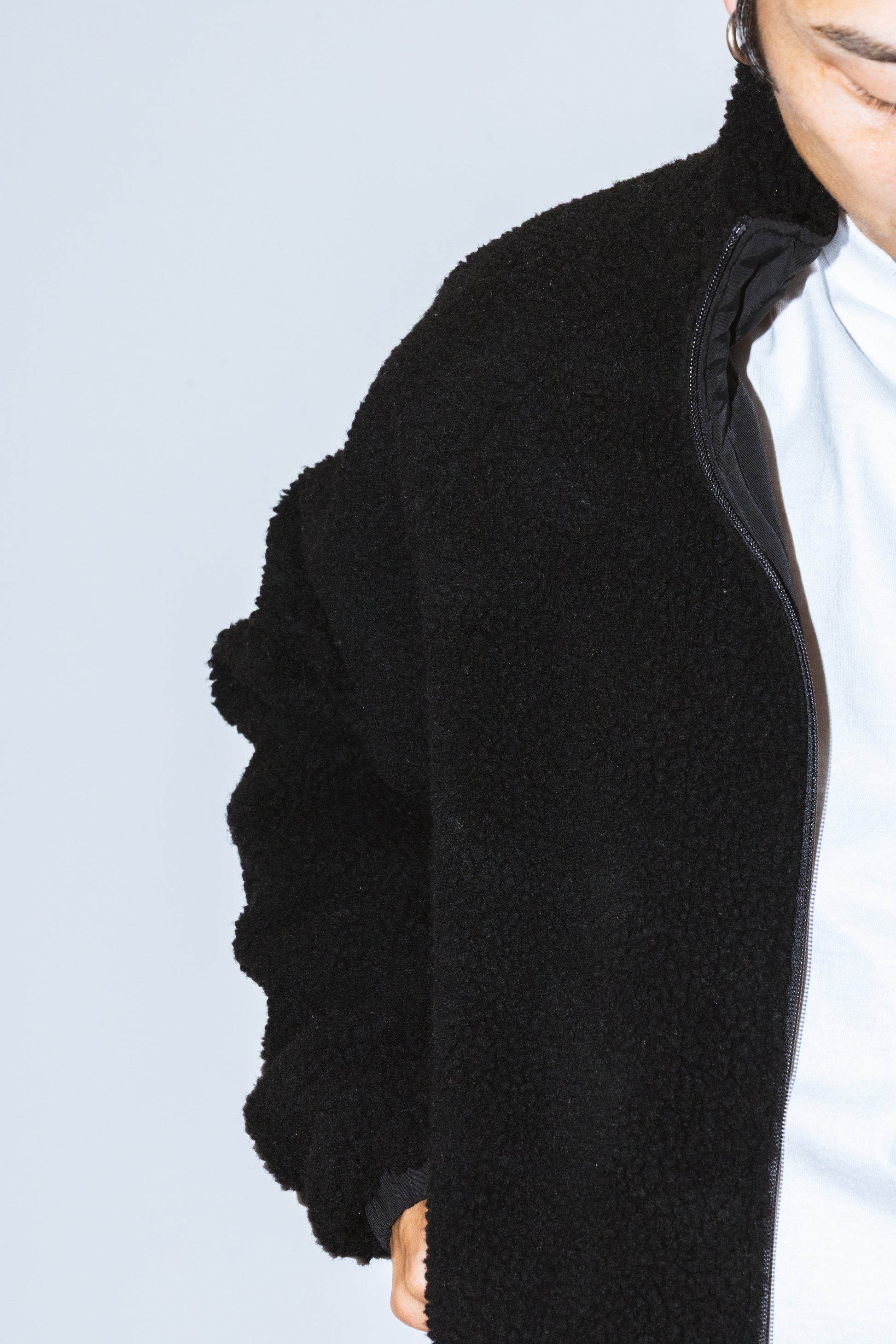 片面には光沢を抑えた高密度のナイロン生地を、もう一方には見た目にも暖かいボア生地を使用した、リバーシブル仕様のジャケット。