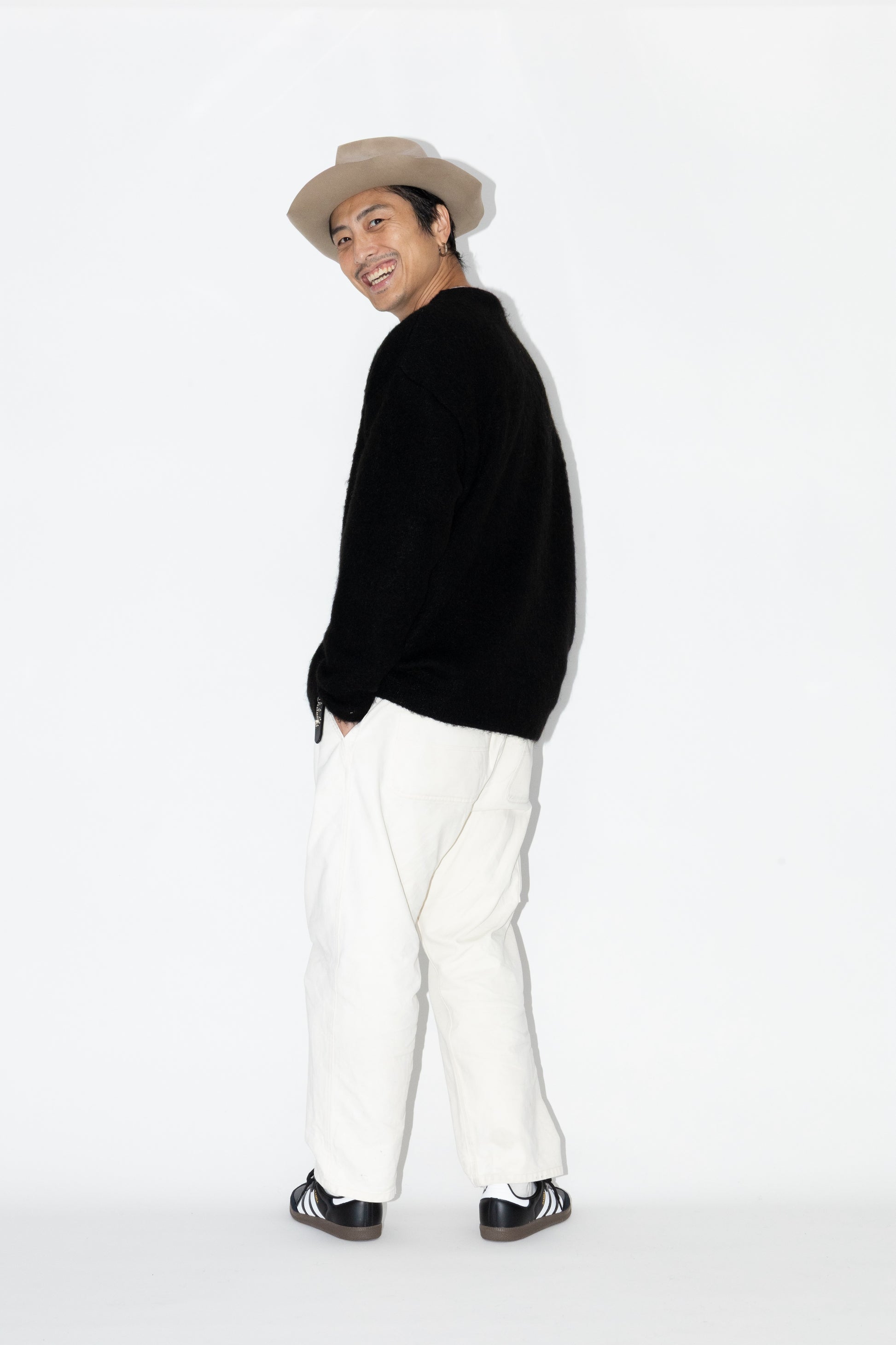 軽さ・柔らかさゆえの型崩れを防ぎつつも、そのフワフワな肌触りや光沢のある質感を最大限活かすため、41% NYLON / 30% MOHAIR / 29% WOOLという糸の組成の黄金比を見極めました。
